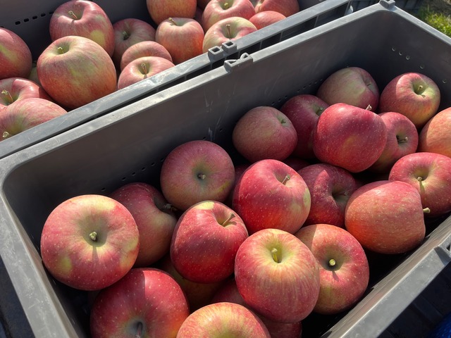 2025年産、当園の葉とらずサンふじです。 通常のサンふじの収穫期間は11月上旬~を予定しておりますが、葉とらずサンふじは収穫最終盤、樹上完熟を目指しますので、比較的蜜入りもしやすく、切り口は見た目にもお楽しみ頂けます。 (りんごの蜜入りは1つ1つ度合いが異なり、年を越えての長期保存で徐々に蜜が抜けていくことがあります。また、蜜入りの良いりんごは内部褐変しやすいとも言われますので、出来るだけお早めにお召し上がり下さい。100%蜜入りをお約束することはできませんのでご了承ください。) ◇まかなえ果樹園のshareクラス shareクラスは、家族や仲間、大切な人と果物を共有して欲しいという想いでつくりました。 果面のきれいなもの~多少のスレ、ガサつき、少しの変形など含まれますが、味に変わりありません。見た目でキズがハッキリわかるものやツルもとの割れ(ツルワレ)、色づきの良くないものは混入しないようにしっかりと選果致します。 見て・食べて美味しさをお楽しみ頂きたいです。 カジュアルな贈り物であったり、多くの方々と美味しさを分かち合いたい、分かち合ってほしいという想いで、りんご一個一個をキャップ詰めでご用意しております。 ◇【葉とらず栽培】について りんごを満遍なく赤く色づけるために『摘葉』『葉取り』という、りんごのまわりの葉を摘み取る作業がありますが、葉とらず栽培ではそれを行いません。葉は太陽の光を浴びて光合成を行い、養分をりんごに届ける役割があります。葉とらず栽培では太陽と葉の力でたっぷりと旨味を蓄えたりんごが出来上がります。 うまく光があたれば真っ赤ですし、葉の影の部分は色むらとなるため、箱を開けると1つ1つの色が揃わないことが多いですが、それは味にこだわった証です。